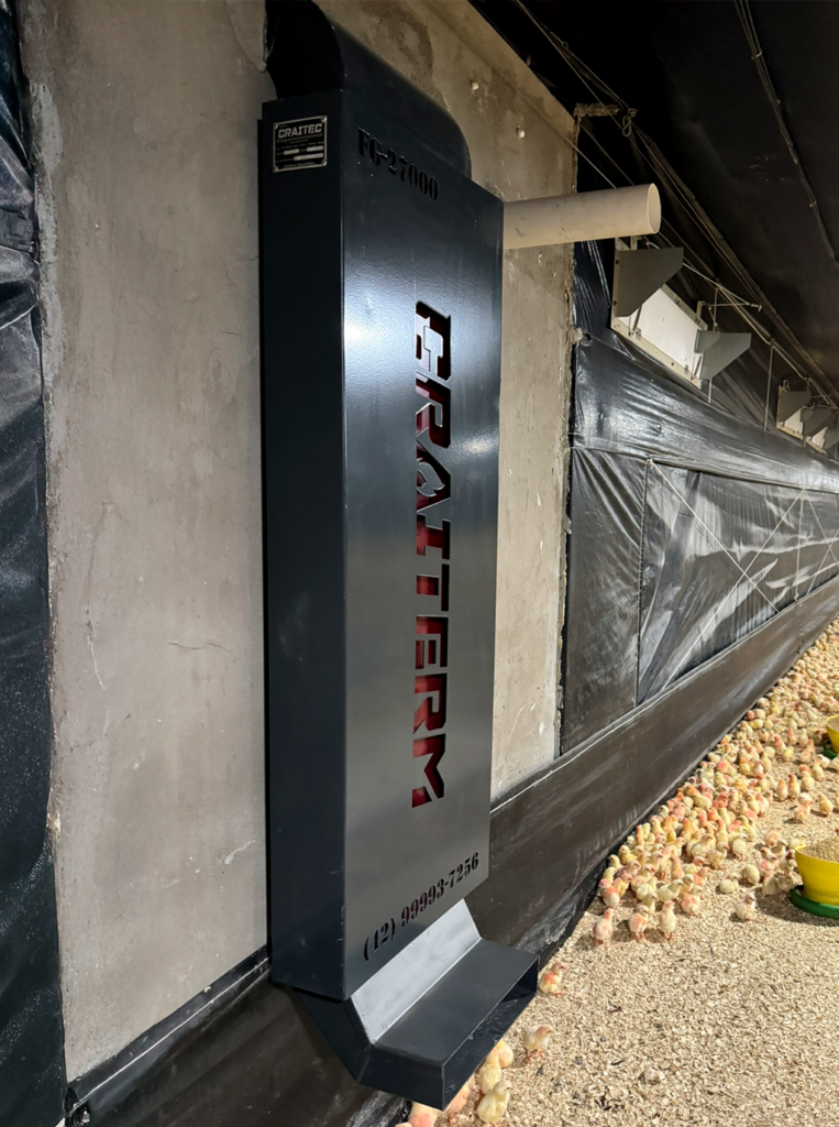 O forno CRAITERM funciona puxando o ar do ambiente com dois exaustores. Parte desse ar já vem aquecido, o que melhora a eficiência e reduz o consumo de energia. Esse ar é pressurizado, passa por um sistema de aquecimento otimizado e sai com temperatura constante entre 80° e 100°C, garantindo o conforto térmico ideal na granja.
